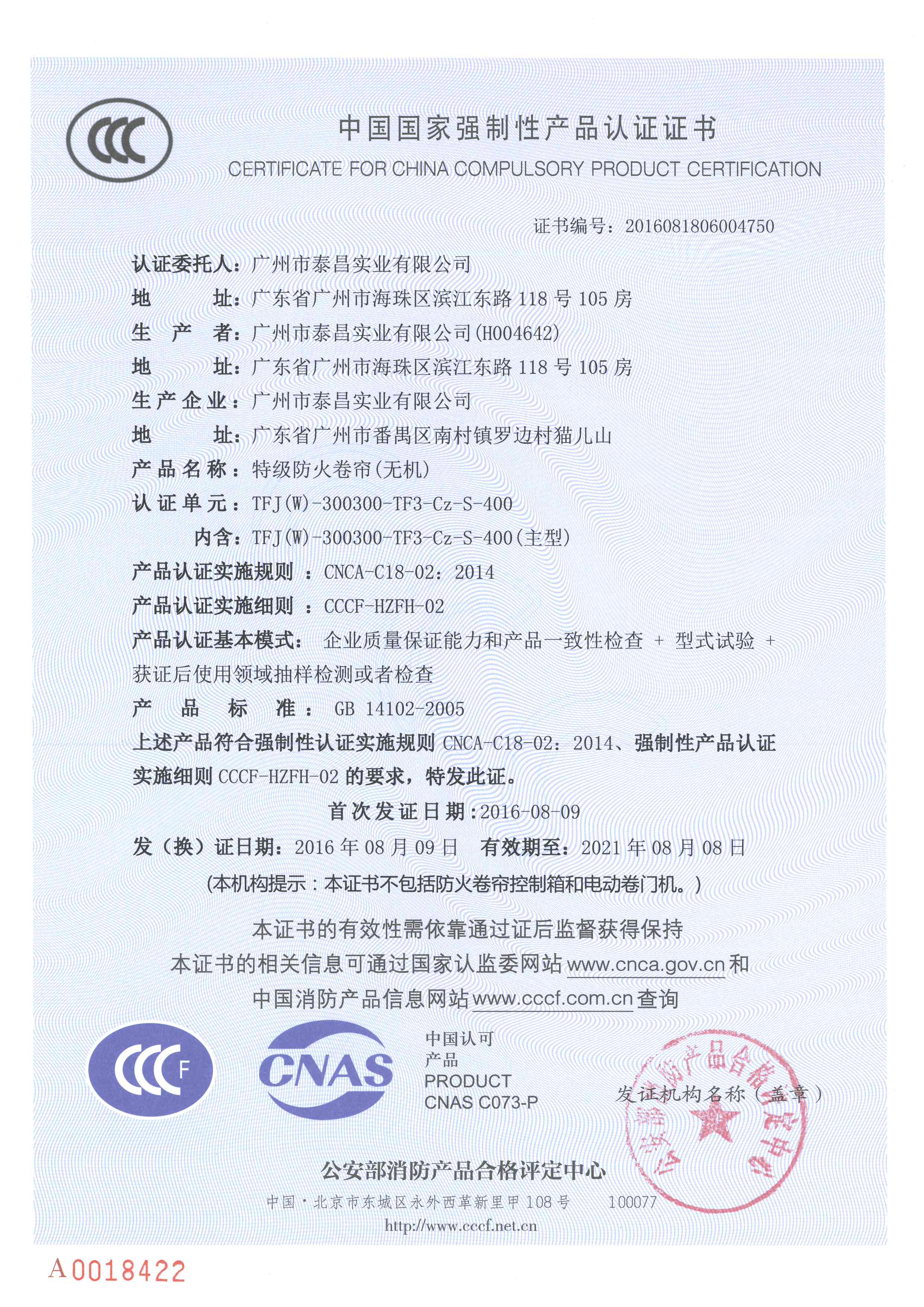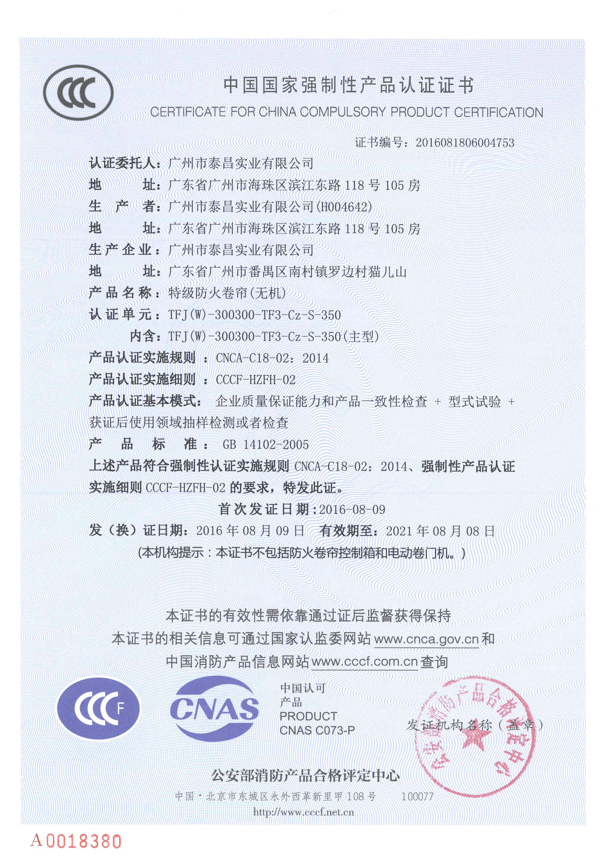 钢质防火卷帘3C认证 钢质防火、防烟卷帘3C认证