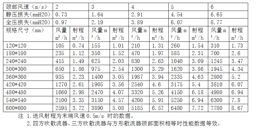 1、方形散流器规格及功能列表